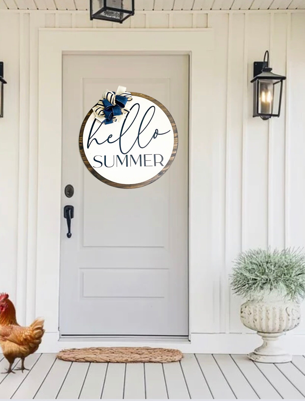 Welcome the beauty of summer into your home with this charming Hello Summer front door sign. This 18-inch wood round wreath adds a touch of farmhouse style to your entryway, creating a warm and inviting atmosphere for all who enter. Handcrafted with rustic flair, this front door decor piece is the perfect addition to your front porch, serving as a delightful summer home decor accent. Make a statement with this unique and stylish summer sign that captures the essence of the season in a truly picturesque way.