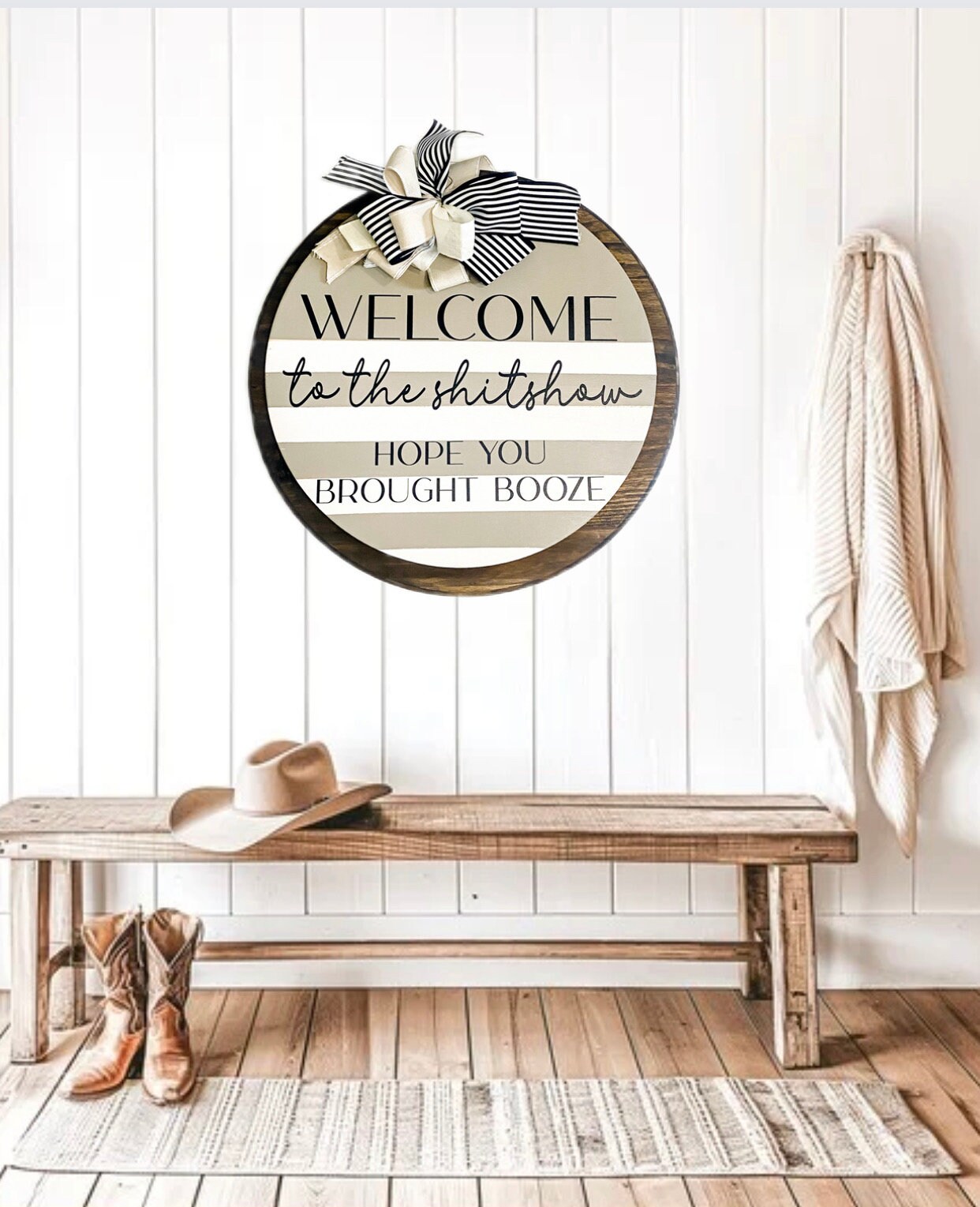 Welcome guests to your own little slice of chaos with this Welcome to the Shitshow, Hope You Brought Booze front door sign! Measuring 18 inches round, this wood door wreath makes a statement with its farmhouse style and humorous touch. Perfect for adding a touch of humor to your wall decor or as a porch sign to welcome visitors with a bit of wit. Sprinkle some laughter and fun into your space with this funny door sign that is sure to make everyone smile.