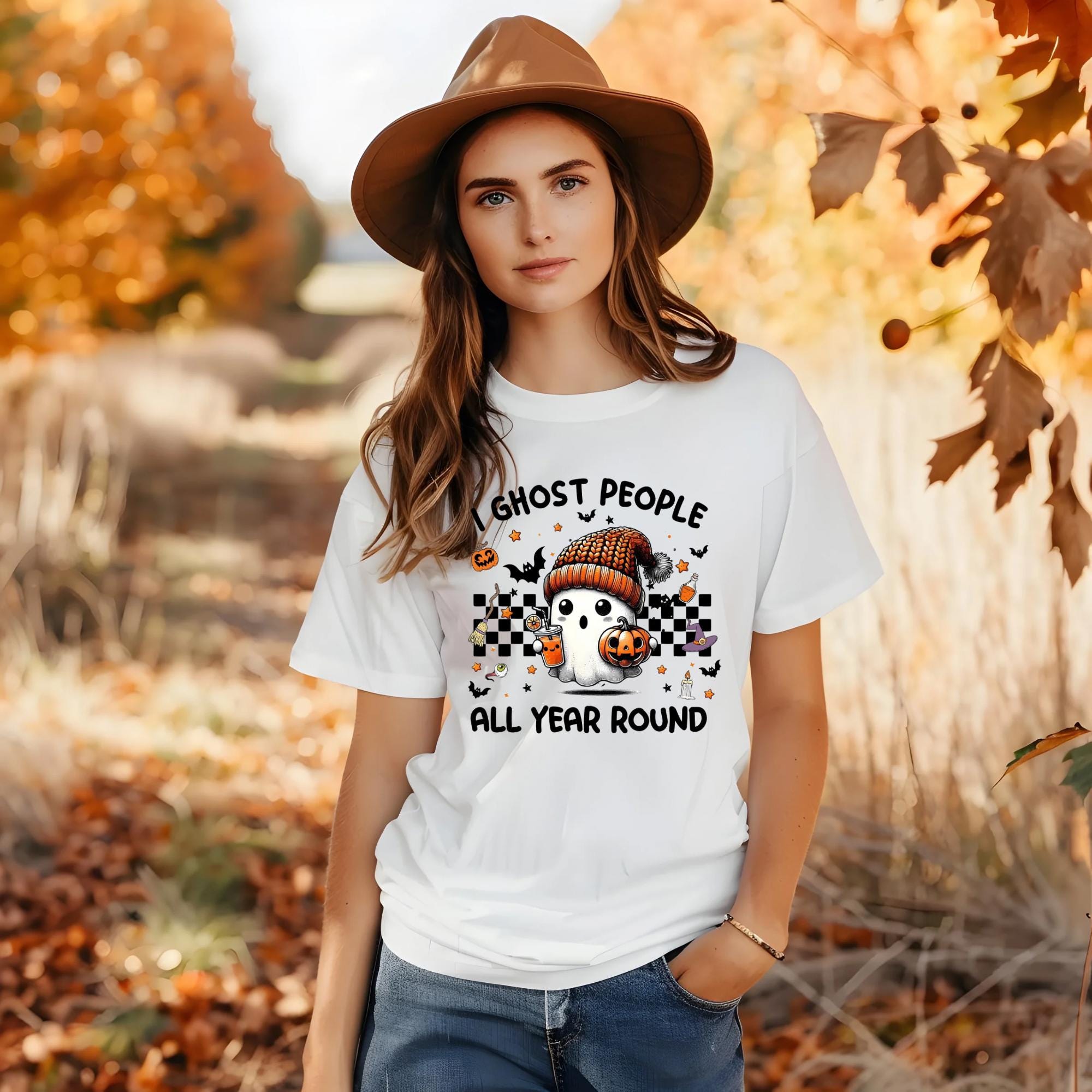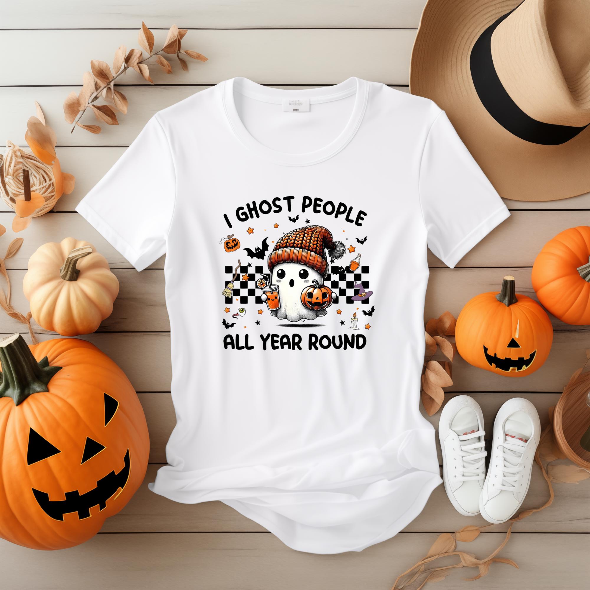 A Halloween-themed Women's Fall apparel T-shirt with the text 'I ghost people all year round'. This T-shirt gives off a spooky yet fun vibe, perfect for Halloween enthusiasts and those who enjoy a bit of humor in their wardrobe. It is relevant for Halloween, fall season, and costume parties.