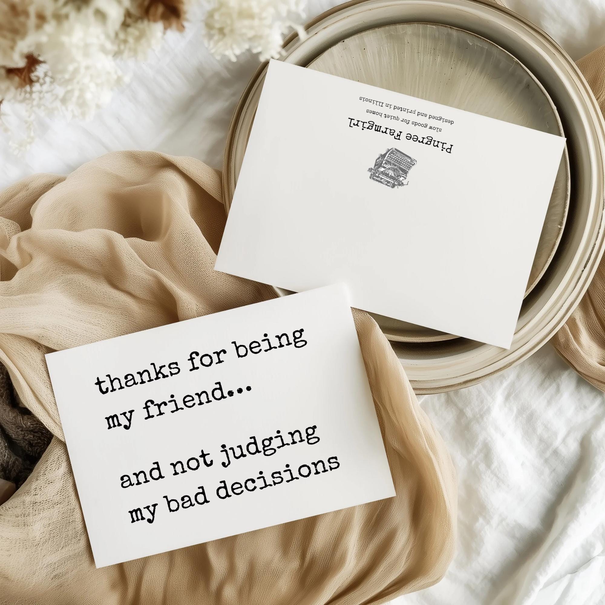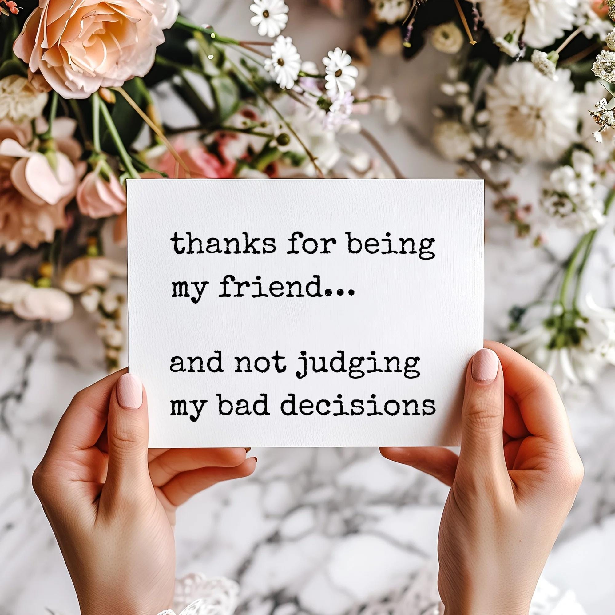 Thanks for Being My Friend and Not Judging My Bad Decisions Card, Funny Best Friend Card, Sarcastic Friendship Card, Women Humor Gift